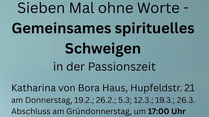Ab 19. Februar treffen wir uns jeden Donnerstag um 17:00 Uhr im Kirchsaal des Katharina-von-Bora-Hauses zu einer Stunde gemeinsamen Schweigens unter Anleitung von Pfarrer Hardy Rheineck. Vorher kurz und nachher auch länger gibt es die Möglichkeit zum Gespräch.